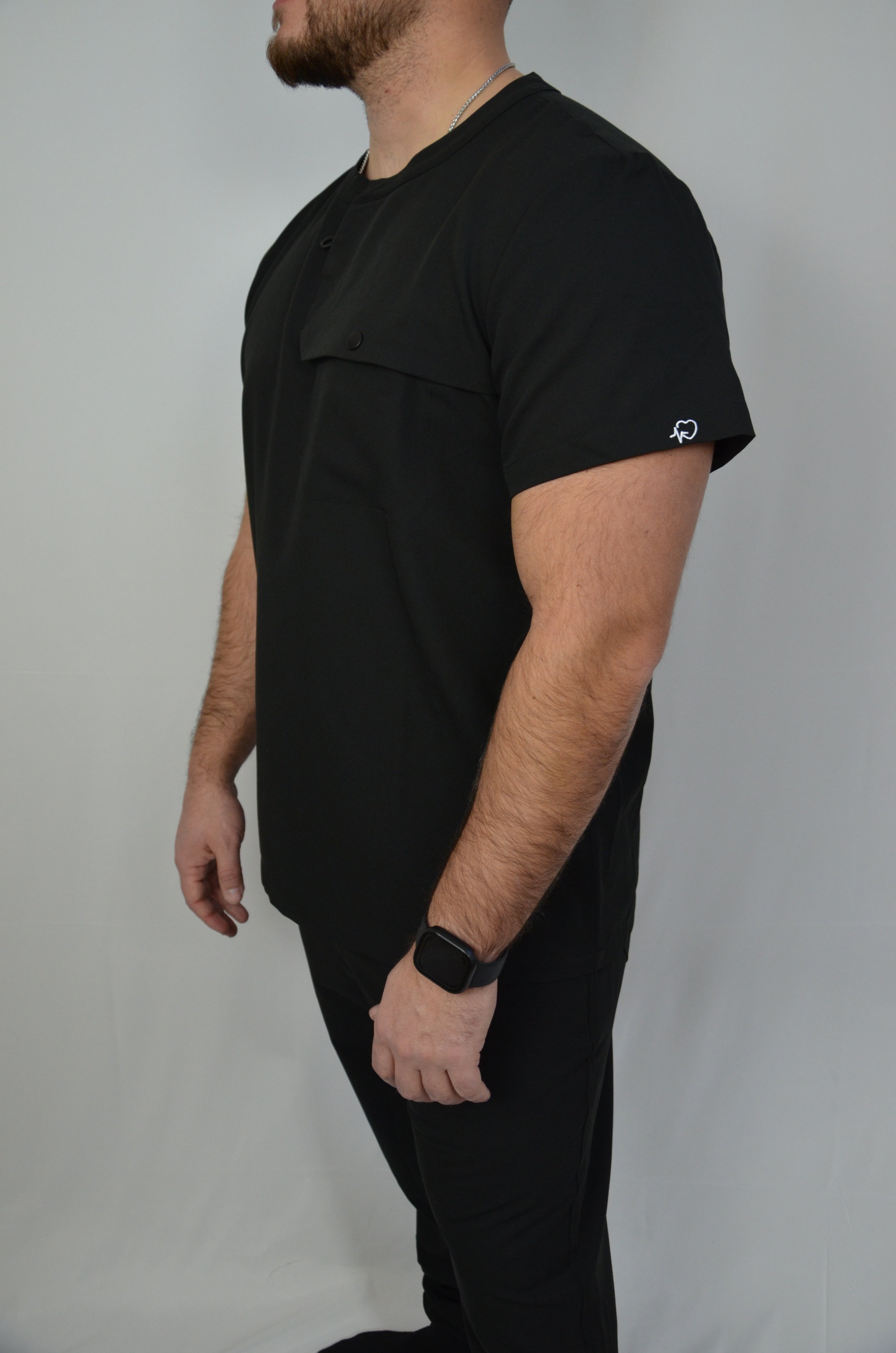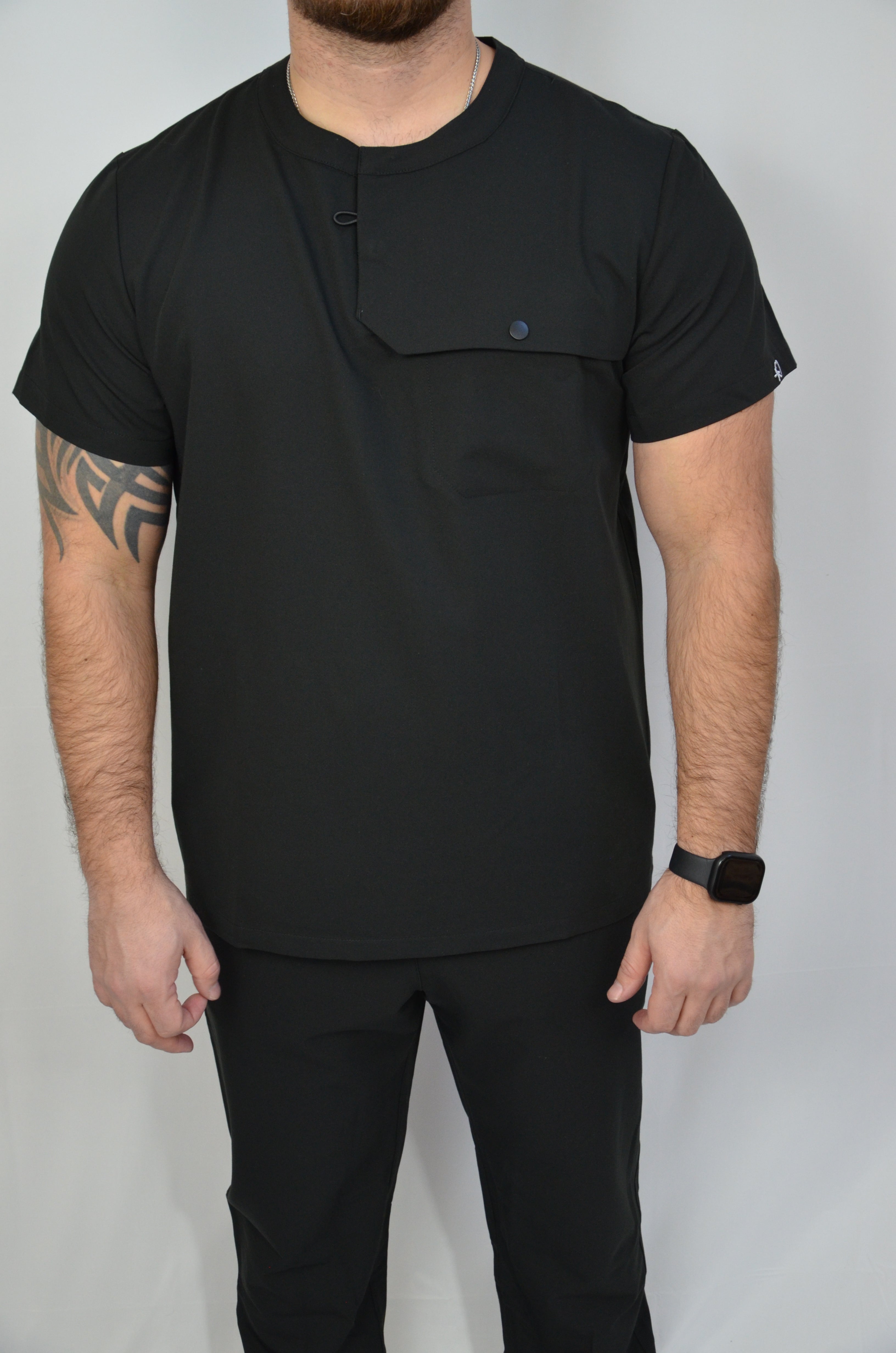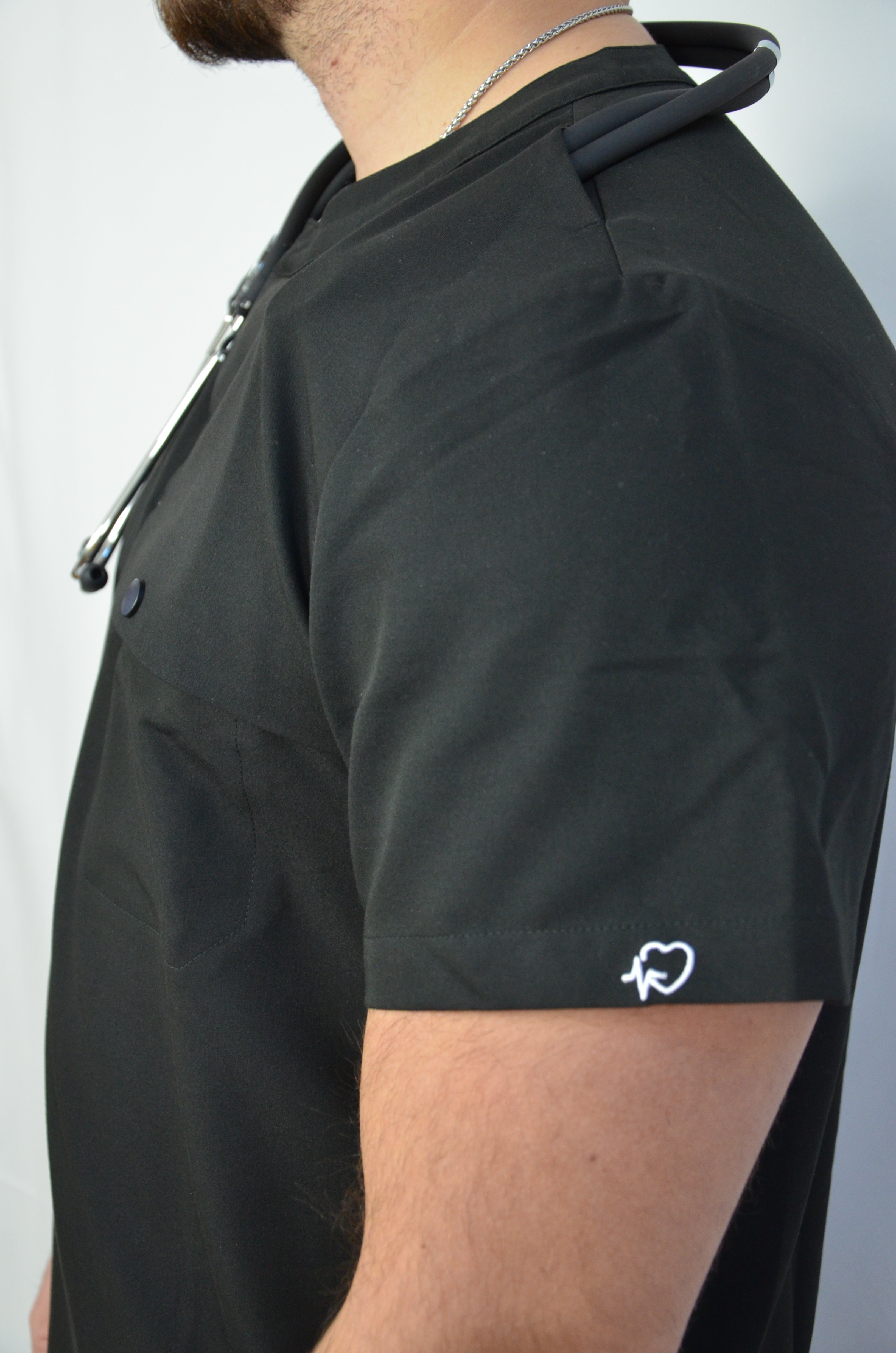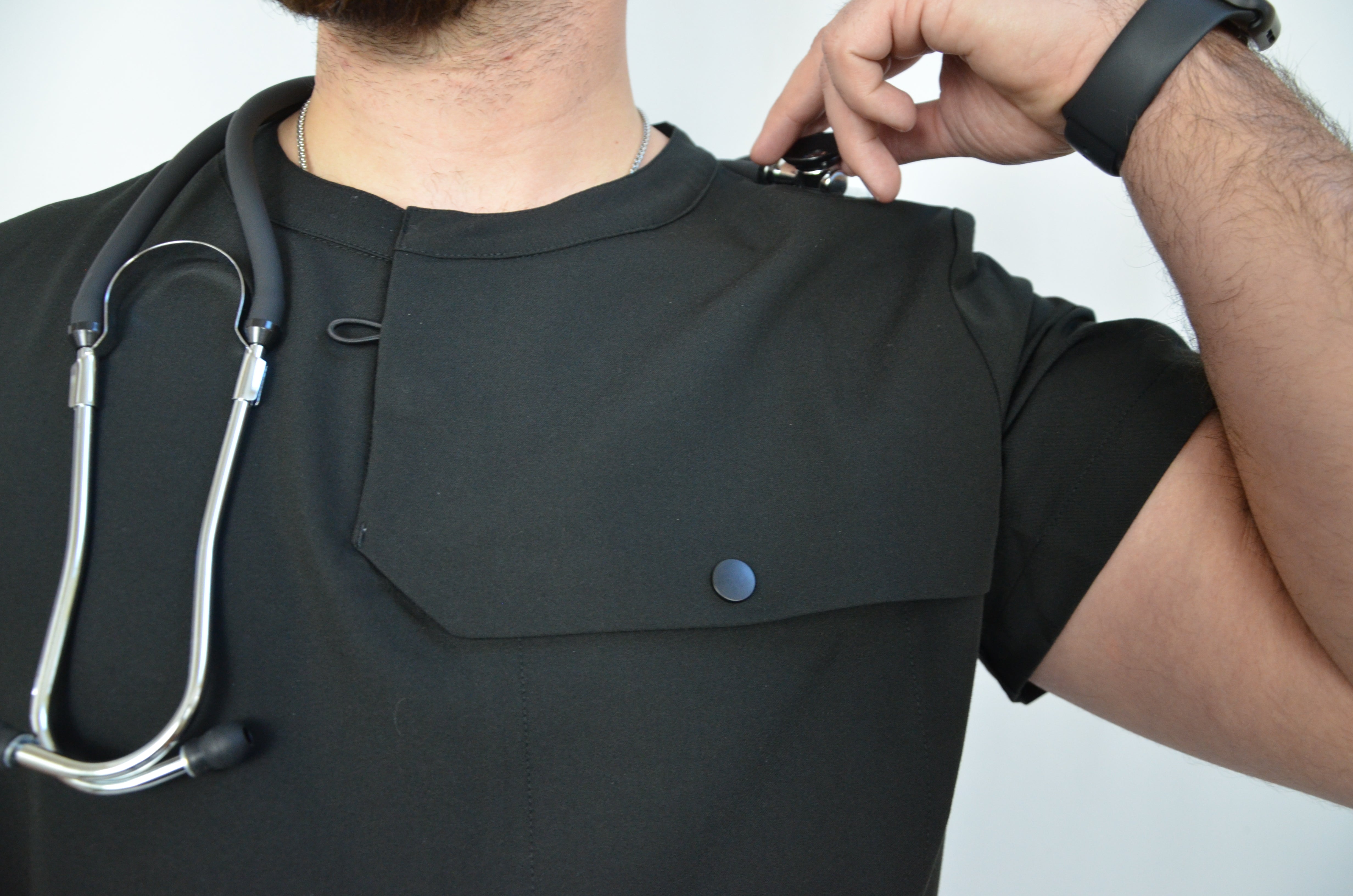 Designed with function in mind, this men’s scrub top features a dedicated stethoscope holder with a secure mini pocket to keep it in place throughout your shift. A snap-closure chest pocket adds extra security, preventing items from falling out when bending or moving. Crafted from breathable, flexible fabric for all-day comfort, this top delivers reliable performance with a polished, professional fit.